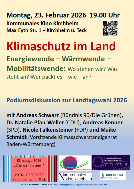 Im Rahmen der Kirchheimer „Klimatage 2026“ findet am Montag, 23. Februar 2026 ab 19.00 Uhr im Kommunalen Kino Kirchheim (Max-Eyth-Str. 1) eine Podiumsdiskussion zur Landtagswahl zum Thema „Klimaschutz im Land“ statt. Mehr Informationen beim Veranstalter, dem Kirchheimer Forum 2030 Maike Schmidt, die Vorsitzende des Klimasachverständigenrats Baden-Württembergs stellt auf der Grundlage des aktuellen „Fortschrittsberichts“ des Beratungsgremiums…